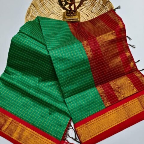 Green and Red Premium Gadwal Pattern Cotton Checked Saree with Grand Jari Pallu
