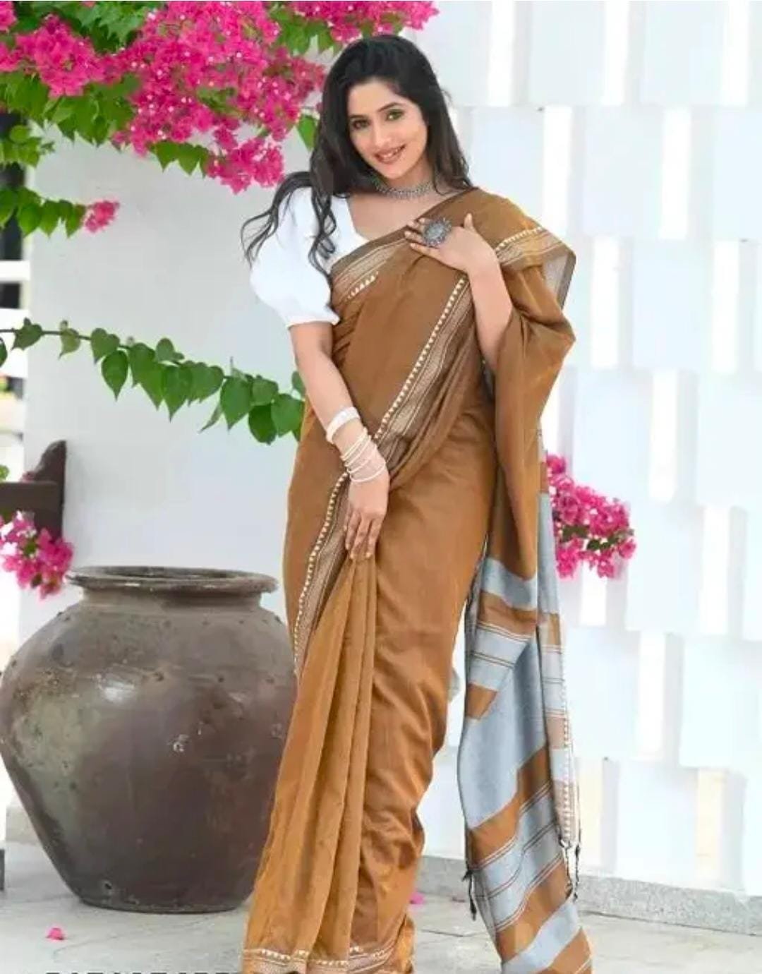 Mayuri Maud presents a masterpiece of simplicity and sophistication—our Exclusive Weaving Border Pure Cotton Saree. Crafted for the woman who values the natural comfort of pure fibers, this saree is a testament to timeless Indian weaving traditions.