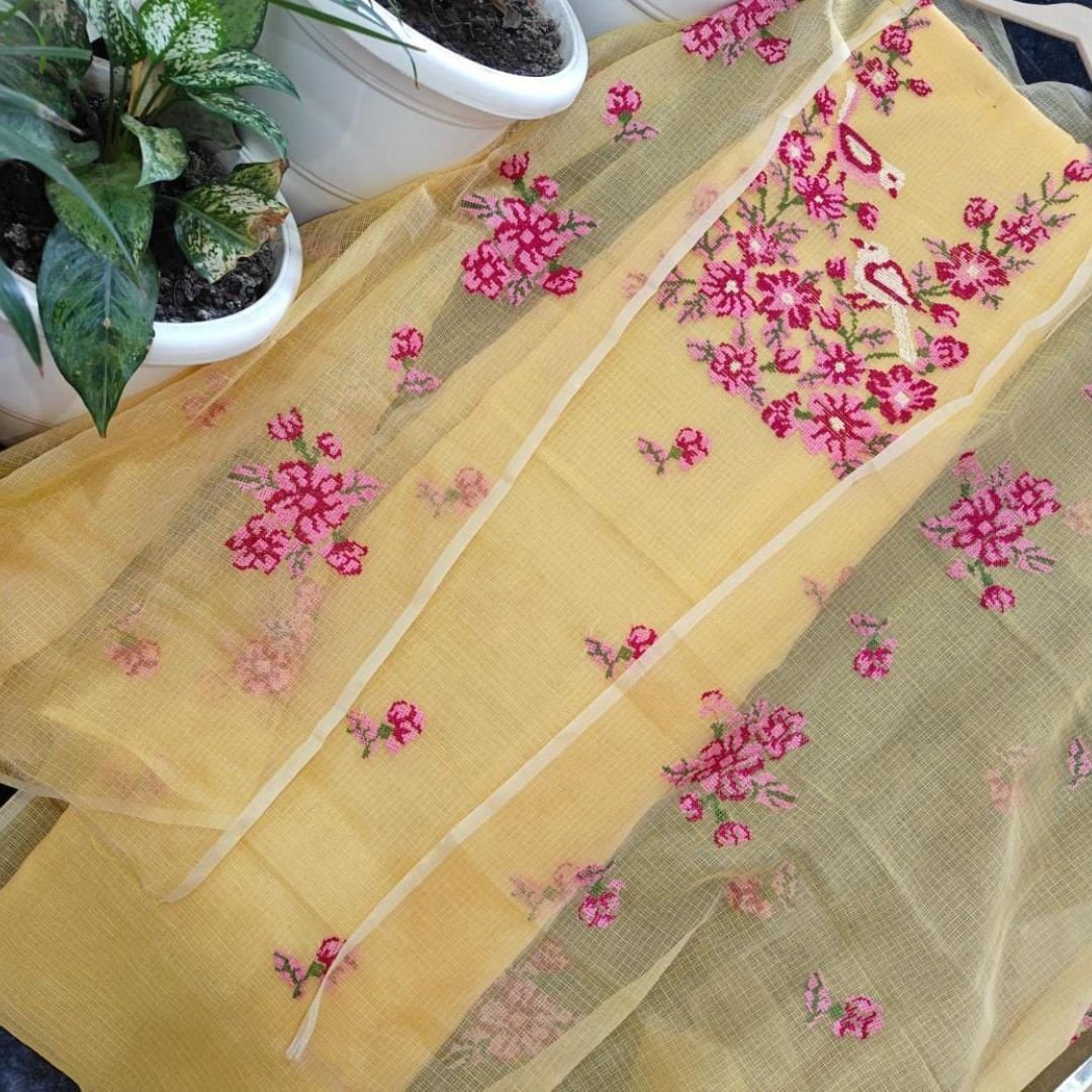 Kota doria dress materials top and dupatta with intricate embroided flowers giving it elegant look.