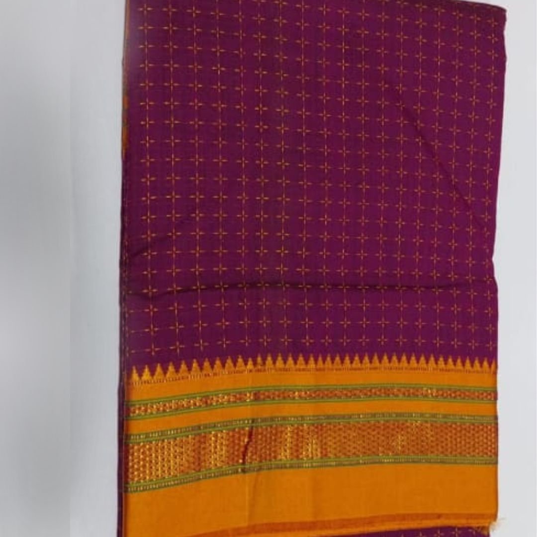 The heart of ilkal patterned sarees, with thousands of thread boxes and dots. Very intricate and handmade. Use with most delicate handling. Washing by dry cleaning is advised. But when worn adds glam to the wearer. Best for All corporate workers, hospital or health care related professionals, school teachers