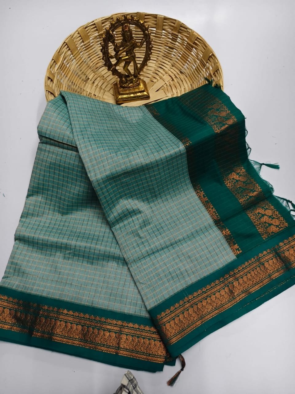 Be the first to review “Sea Green Premium Gadwal Pattern Cotton Checked Saree with Grand Jari Pallu”